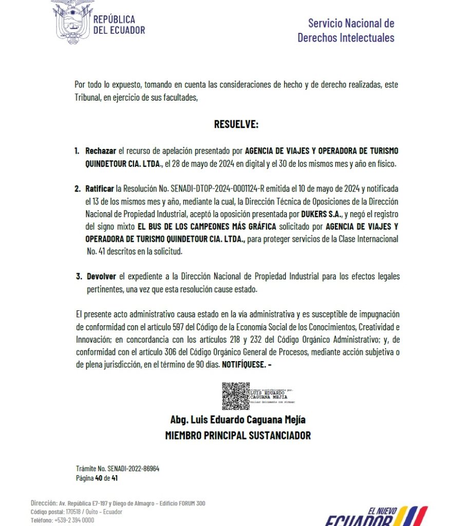 CON FECHA 17 DE JULIO DEL 2025 - EL OCDI RESUELVE RATIFICAR - RESOLUCIÓN DE OPOSICION AL REGISTRO EL BUS DE LOS CAMPEONES